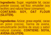 - Sugar, vegetable fat, cacao powder (cocoa), oat flour, emulsifier (soy lecithin) and natural flavor (cinnamon). CONTAINS: SOY, OAT FLOUR (GLUTEN).