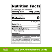 - Chiles habaneros, agua, sal yodada, especias, ácido acético, ácido cítrico, metabisulfato de sodio (como antioxidante) goma xantana, benzoato de sodio como conservante, amarillo FD&C No. 5 y azul FD&C No. 1