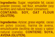 - Sugar, vegetable fat, cacao powder (cocoa), oat flour, emulsifier (soy lecithin) and natural flavor (cinnamon). CONTAINS: SOY, OAT FLOUR (GLUTEN).
